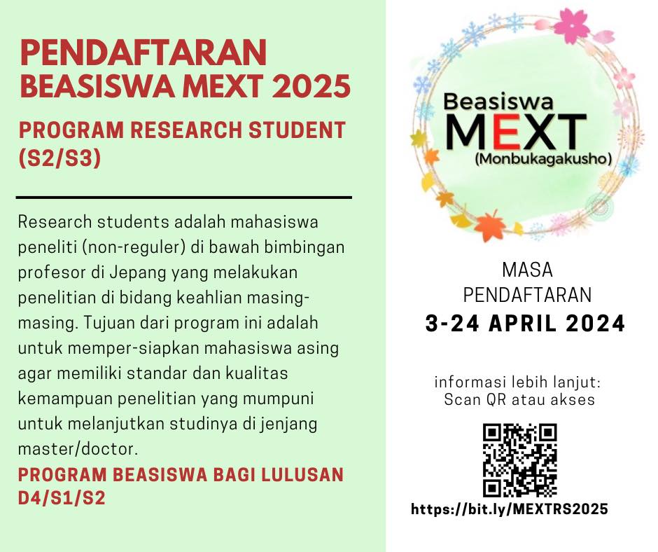 Bagi teman-teman lulusan D4/S1/S2 yang sudah menunggu pembukaan Beasiswa MEXT/Monbukagakusho, kami ingin menyampaikan bahwa pendaftaran beasiswa MEXT program Research Students untuk keberangkatan tahun 2025 telah dibuka!! 🥳🥳